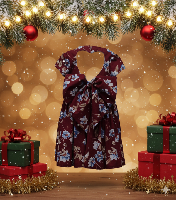 Elegant Heart Backed Dress with Statement Bow. Make a stunning impression with this burgundy floral dress featuring a striking heart back and an oversized bow detail at the back. The vibrant floral pattern adds a touch of charm, while the bow provides a dramatic, fashionable flourish. Ideal for special occasions and festive gatherings.